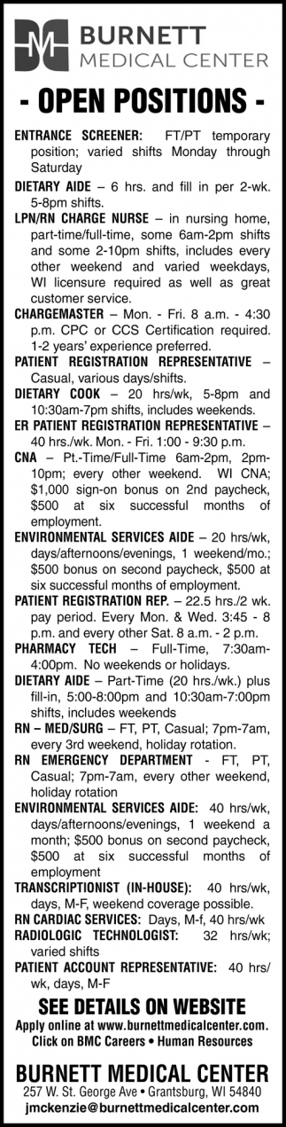 Cna Dietary Aide Him Coder Chargemaster Dietary Cook Burnett Medical Center Grantsburg Wi